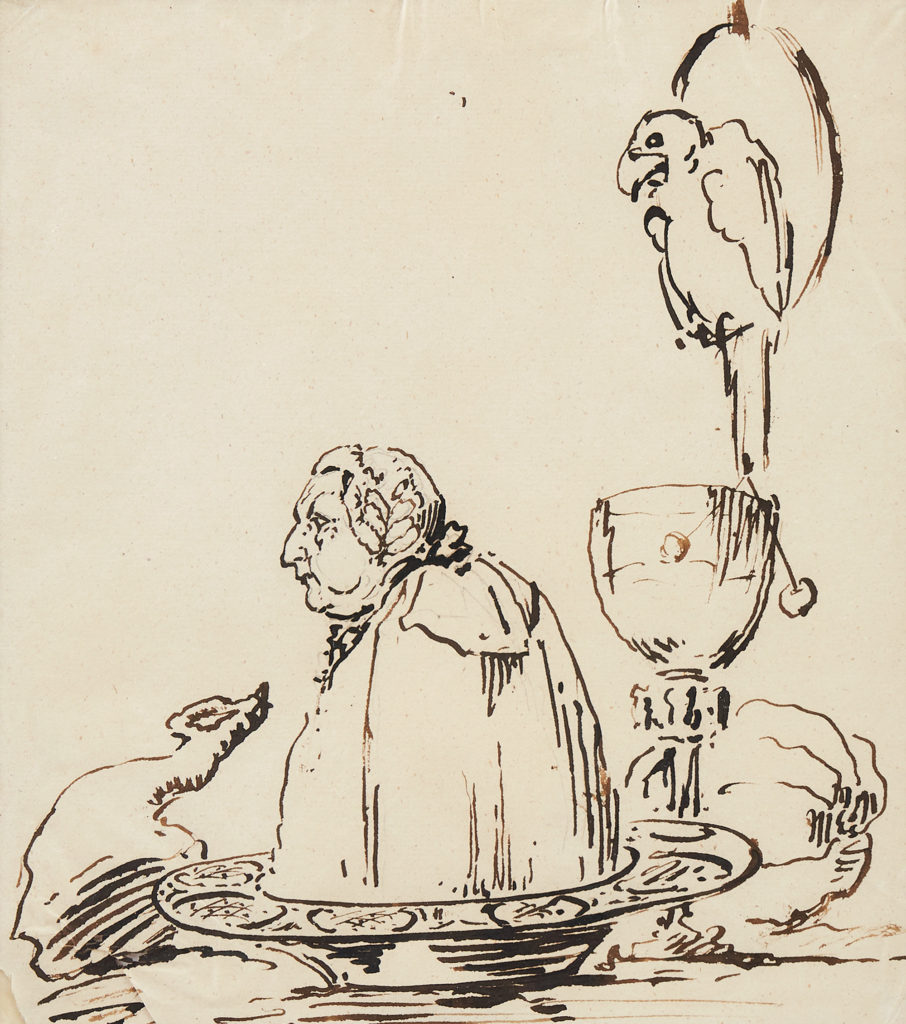 Nr. 48 Carl August Ehrensvärd (1745‑1800) Nattvardsscen; karikatyr föreställande ärkebiskop Uno von Troil (1746‑1803). Blyerts och tusch på papper, 22,5 x 20,5 cm.