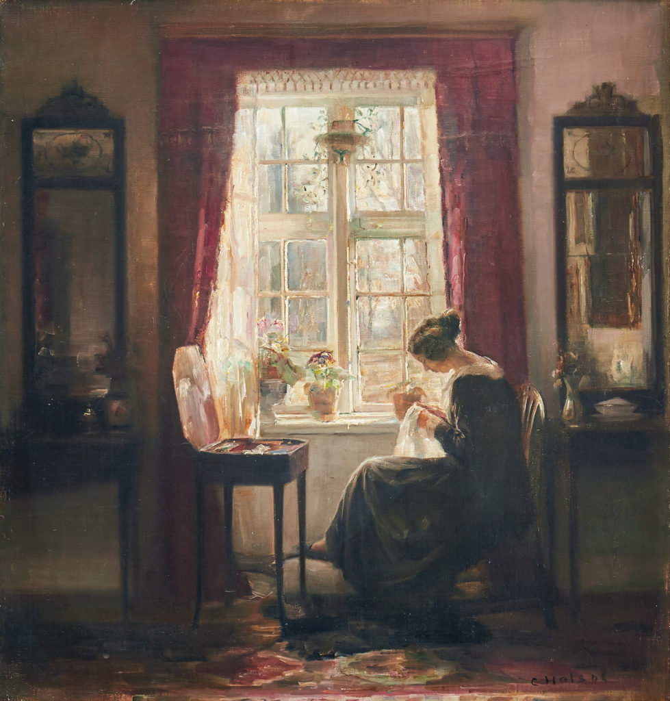 Lot 824 Carl Holsøe (Denmark 1863-1935). The artist’s wife seated by a window with her needle work. Signed C Holsoe. Oil on canvas, 60 x 58 cm.