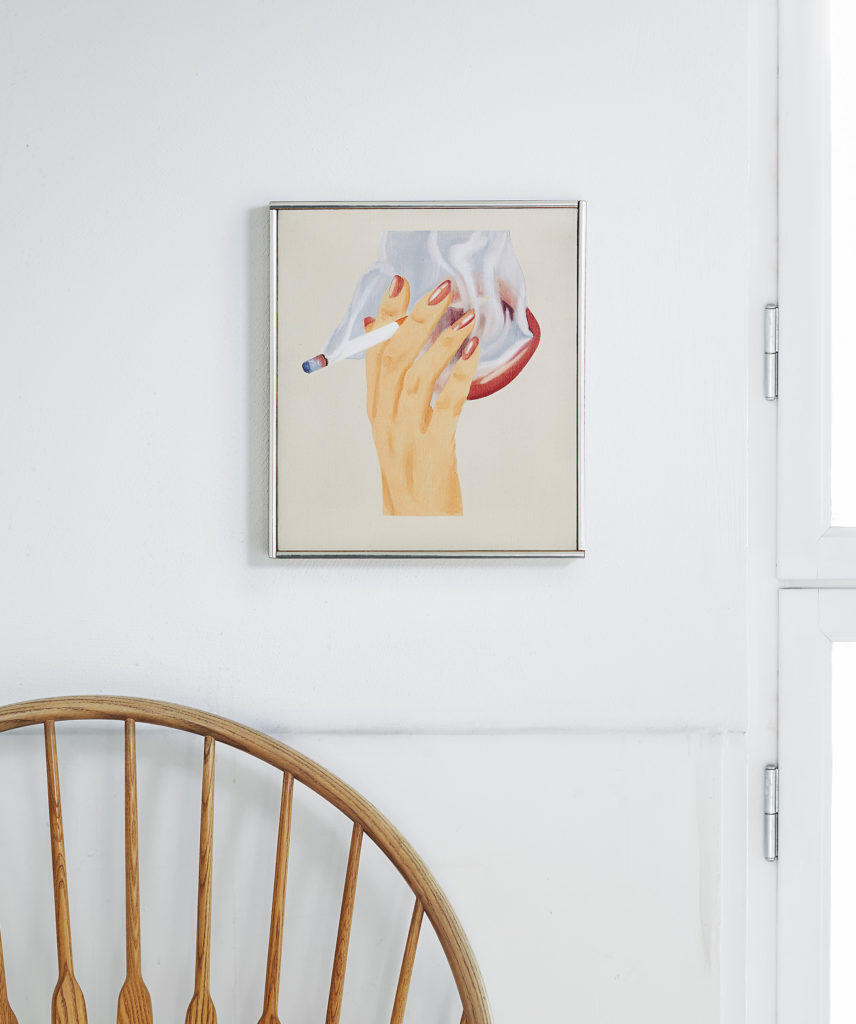 The present work “Smoker Study”, executed in 1972, offers an alluring example of the Smoker series. Wesselmann’s oil studies provides intimate versions of his famous billboard canvases. In his drawings and oil studies, he would often merge and separate different elements to explore the motif from different angles and perspectives. In some of his paintings from the Smoker series, the mouth has been turned 90 degrees or is even seen upside down, exhaling the smoke towards only one side of the canvas. In the late 1960s, Wesselmann focused mainly on the mouth, often depicted closed with a cigarette balancing between the lips, but in the 1970s he began to experiment by opening the mouth to reveal the white row of teeth. During these years, he introduced the hand holding the cigarette and the elaborate smoke patterns, as seen in the present painting. The attention to details is of outmost importance in the smoker oeuvre of Tom Wesselmann, as he captures his models in a brief and highly intense moment. There is a subtle but obvious sensuality in Wesselmann’s pictures depicting smoking women – the red lips on a half-open mouth, the elegant hand holding a cigarette between her fingers and the red nail polish linking the elements together. The translucent spirals of smoke wandering its way between the fingers and around her lips exude the feeling of strength and intimacy, but the viewer is also left with questions about her true identity. In his own book, which he wrote under the pseudonym Slim Stealingworth, the artist states: ”The mouth paintings, later to become the Smoker series, were begun in 1965, and Wesselmann finished the first ones early in 1966. The series represented a further evolution in the shaped canvas: a larger scale, closer views, and concentration on body parts. These first works were isolated mouths, with no environmental additions. The earlier ones were the same kinds of painted mouths as one might find in the nude paintings; only they are slight more detailed. The mouths were primarily in oil, and signalled the fact that Wesselmann’s work now and in the future would be in oil. In this medium, he felt most free to do whatever he needed to do technically, as oil handles in such a way as to make it better for large-scale details, especially those arrived at through extensive brushing.” Luminous and elegant in colour and form, Wesselmann’s depictions of smoking women illustrate the perfect balance between a classical style and modern American Pop Art. ■