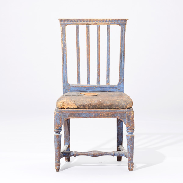Kat. nr. 882 Stol – Helt sanslös! Skicket är fullkomligt sagolikt om man gillar orörda möbler som jag gör. Modellen med ”snibbarna” på ryggbrickan brukar härledas till Gotland, och där kallas de också för snibbstolar. Generationers användande har slitit ner benen så att stolen är för låg, den fantastiska skinnsitsen är lagad och tagelstoppningen tittar fram på sina ställen. Men vad gör det? Jag ser stolen mer som en skulptur. Och en väldigt charmig och fin sådan.